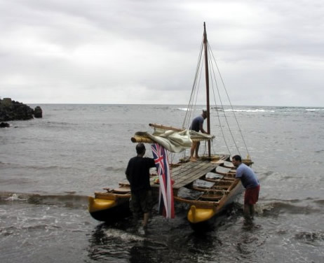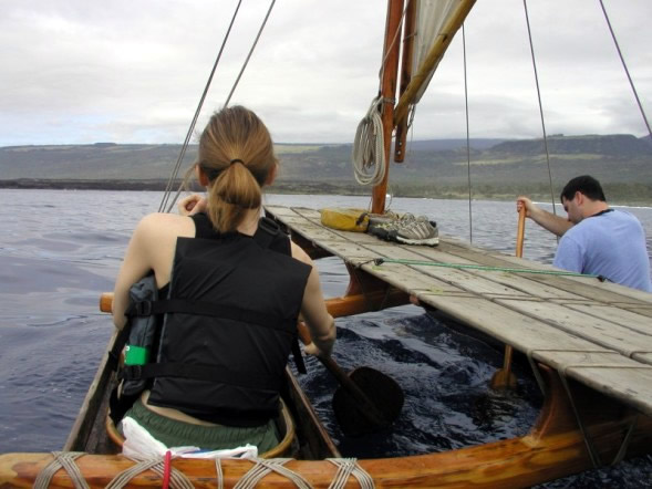 We were on a real beat for about ten minutes or so, when pointing Kiko had me take the spare steering paddle and insert it between the hull and platform about 1/3 of the way back from the bow to act as a sort of leeboard. The boat seemed to point quite well. We were tacking through about 100 degrees, I would say, though it's hard to say how much leeway we were making. Our crew was not inclined to do so, but if one were with a strong and experienced crew one could certainly paddlesail to windward to very good effect.