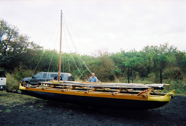 The hulls are identical solid glass from the 50s, taken off a big paddling canoe hull, with a solid deck added and kayak-like openings left for paddlers, very similar to what one sees in pictures of old Hawaiian boats. The boat is steered with a large paddle in the rear from the starboard hull; when on the port tack, you hold the paddle against the outboard side of the hull. When on the starboard tack you can put the paddle on the inboard side of the hull, where the shaft sits nicely against the platform and makes steering very easy. The paddle is not turned, at least I didn't have to when steering the boat while beating and reaching, but rather you dip the paddle deeper to bear off and raise it up to head up. I found it a little difficult to make fine adjustments compared to a rudder, but I only steered for a half hour or so, I'm sure as one gets more used to the technique one would get better.