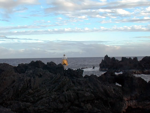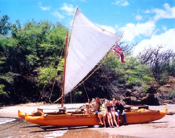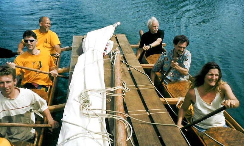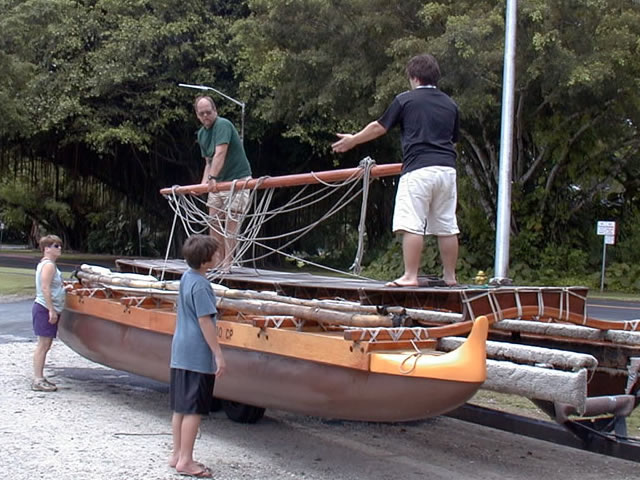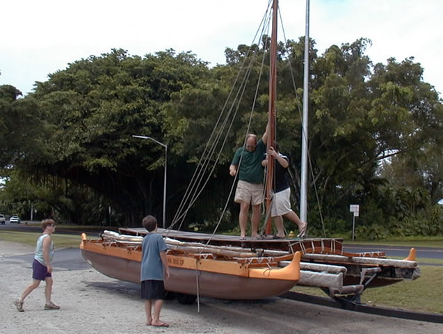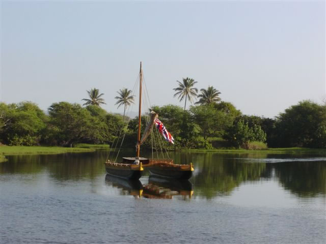 Captain Kiko sails his wa’akaulua (double canoe) from the mouth of the Wailoa River in Hilo, Hawaii.